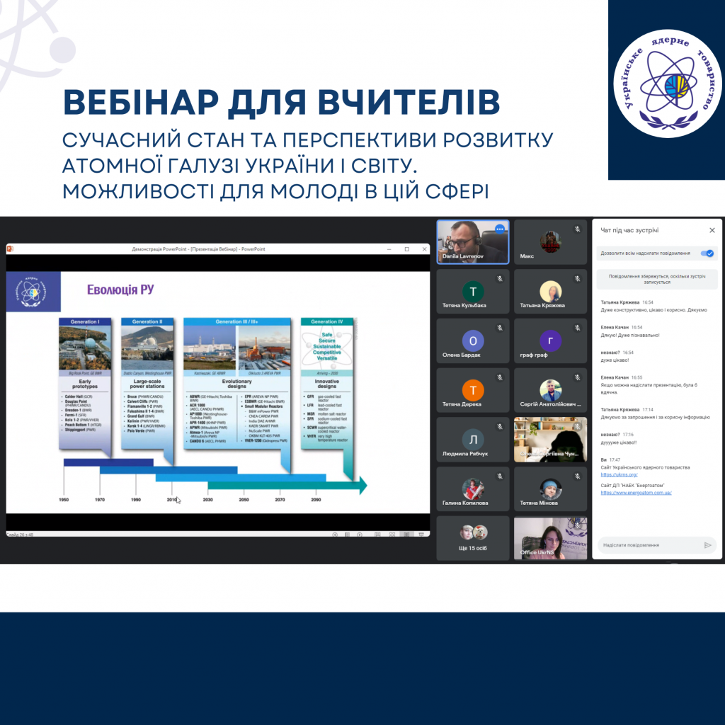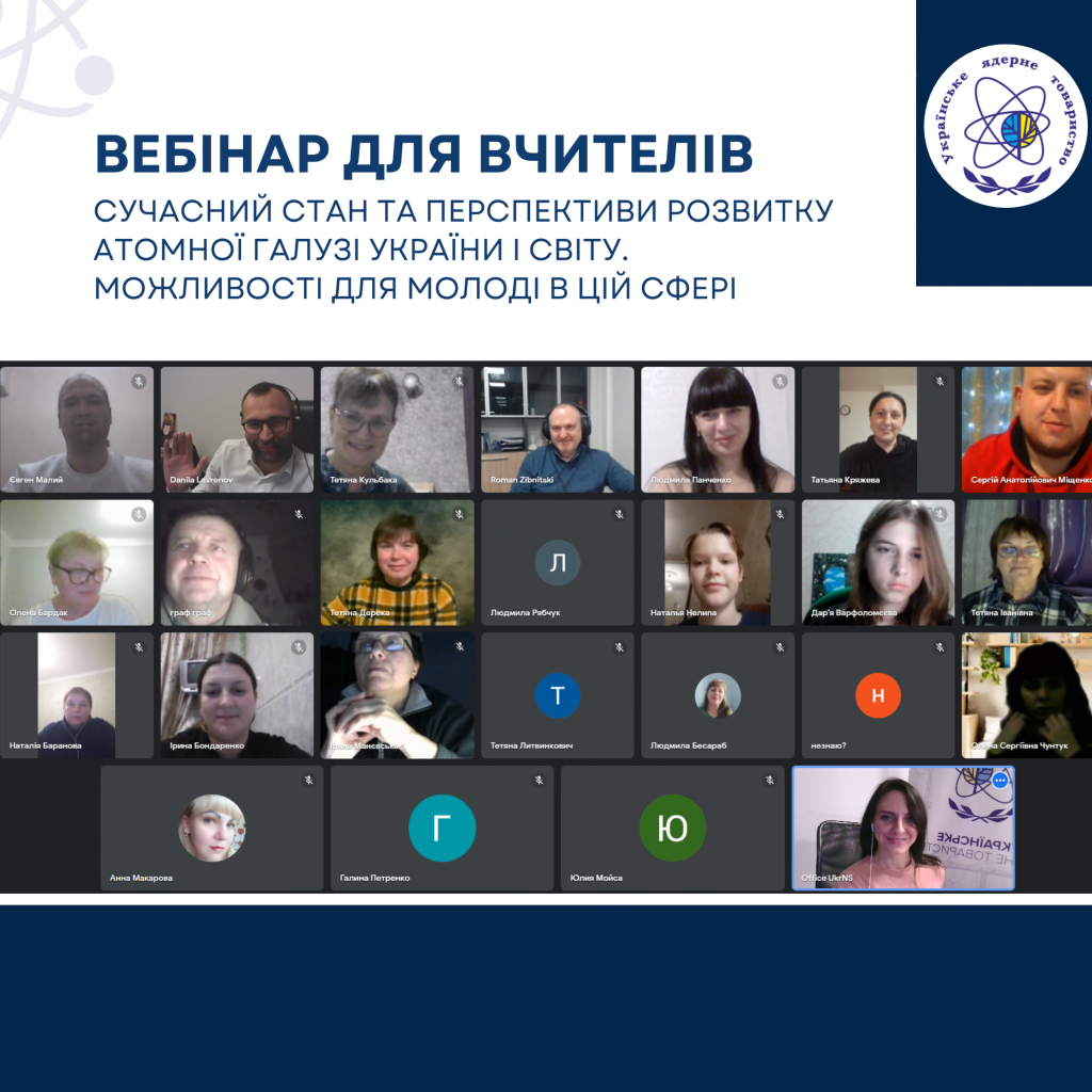 Онлайн захід для освітян був вдруге організований Українським ядерним товариством з метою просвітницької роботи та поширення достовірної інформації щодо основних питань функціонування і розвитку атомної галузі, а також ознайомлення громадськості із інформаційними ресурсами для пошуку актуальної інформації про атомну енергетику України.