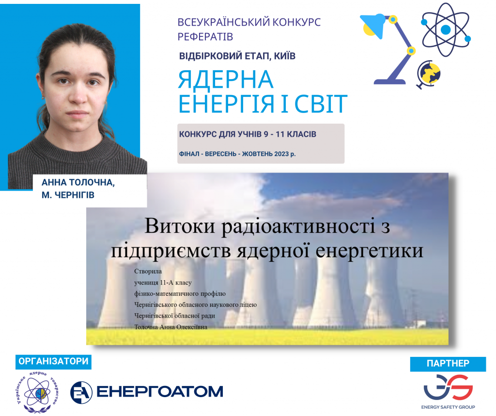 3 місце – Анна Толочна, м. Чернігів, реферат на тему «Витоки радіоактивності з підприємств ядерної енергетики».