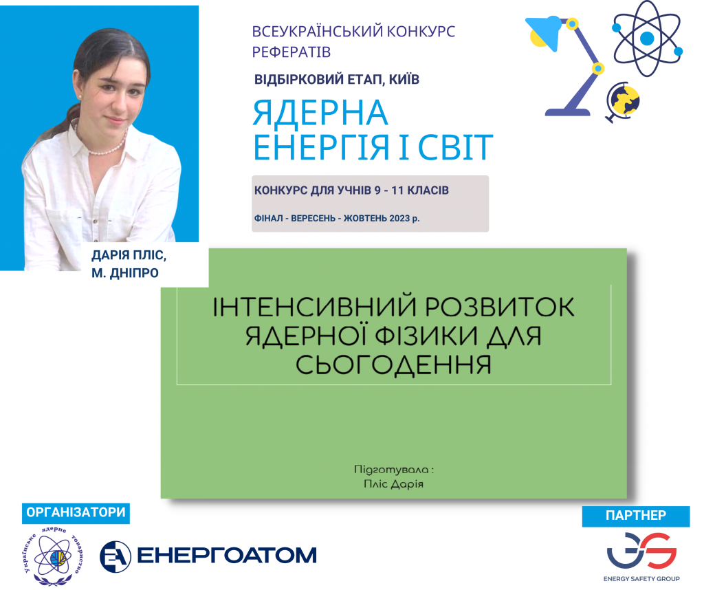 2 місце – Дарія Пліс, м. Дніпро, реферат на тему«Інтенсивний розвиток ядерної фізики для сьогодення».