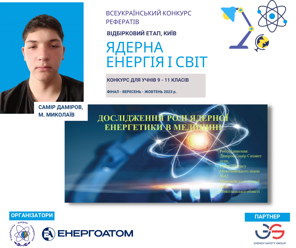 1 місце – Самір Даміров, м. Миколаїв, реферат на тему «Дослідження ролі ядерної фізики в медицині».