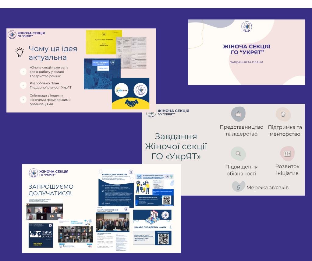 Учасниці засідання обговорили плани та завдання діяльності жіночої секції. Зокрема, щодо створення спільноти всередині громадської організації задля підтримки жінок, що працюють у ядерній галузі, сприяння їхньому професійному та особистому розвитку, оперативного обміну ідеями та планами, залучення більш широкого кола фахівчинь до реалізації заходів та проектів Товариства, налагодження співпраці з іншими жіночими галузевими й громадськими організаціями України й інших країн, а також до просвітницьких та освітніх заходів за участі представниць УкрЯТ.