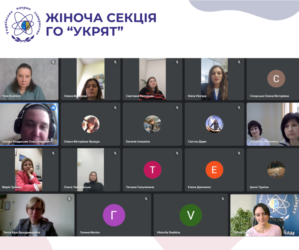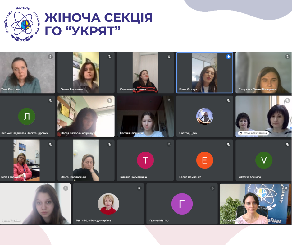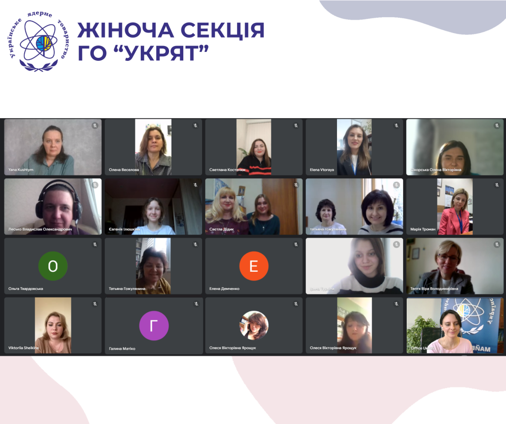 Перше, після тривалої перерви, засідання жіночої секції Українського ядерного товариства відбулося 20 березня у онлайн форматі. До зустріч долучилися представниці відокремлених підрозділів УкрЯТ, також були запрошені і голови осередків Товариства, а також учасниці проектів УкрЯТ для молоді.