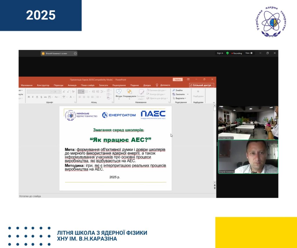 З 18 по 22 серпня 2025 року у Харкові на базі Харківського національного університету ім. В.Н. Каразіна відбувається Літня школа з ядерної фізики для учнів старших класів. Захід організовано Навчально-науковим інститутом «Фізико-технічний факультет» ХНУ за підтримки Європейської мережі ядерної освіти ENEN, а також за участі Українського ядерного товариства, яке вже другий рік поспіль долучається до проведення школи.