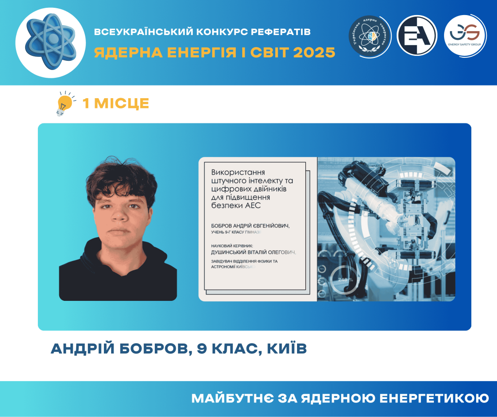 Загалом, тематика конкурсних робіт 2025 року засвідчила високий рівень обізнаності учнівської молоді, її здатність поєднувати фундаментальні наукові знання з актуальними викликами сучасності та прагнення бачити ядерну енергетику не лише як технологію, а як важливу складову сталого розвитку, безпеки та майбутнього України.
