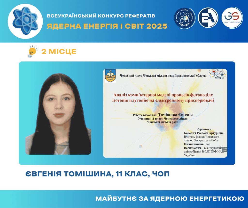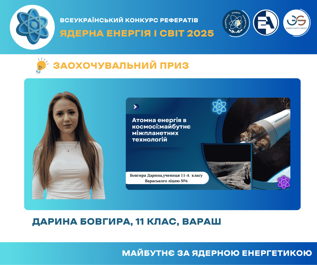 - Дарина Бовгира (Вараш, Вараський ліцей №6, 11 клас) «Атомна енергія в космосі: майбутнє міжпланетних технологій»