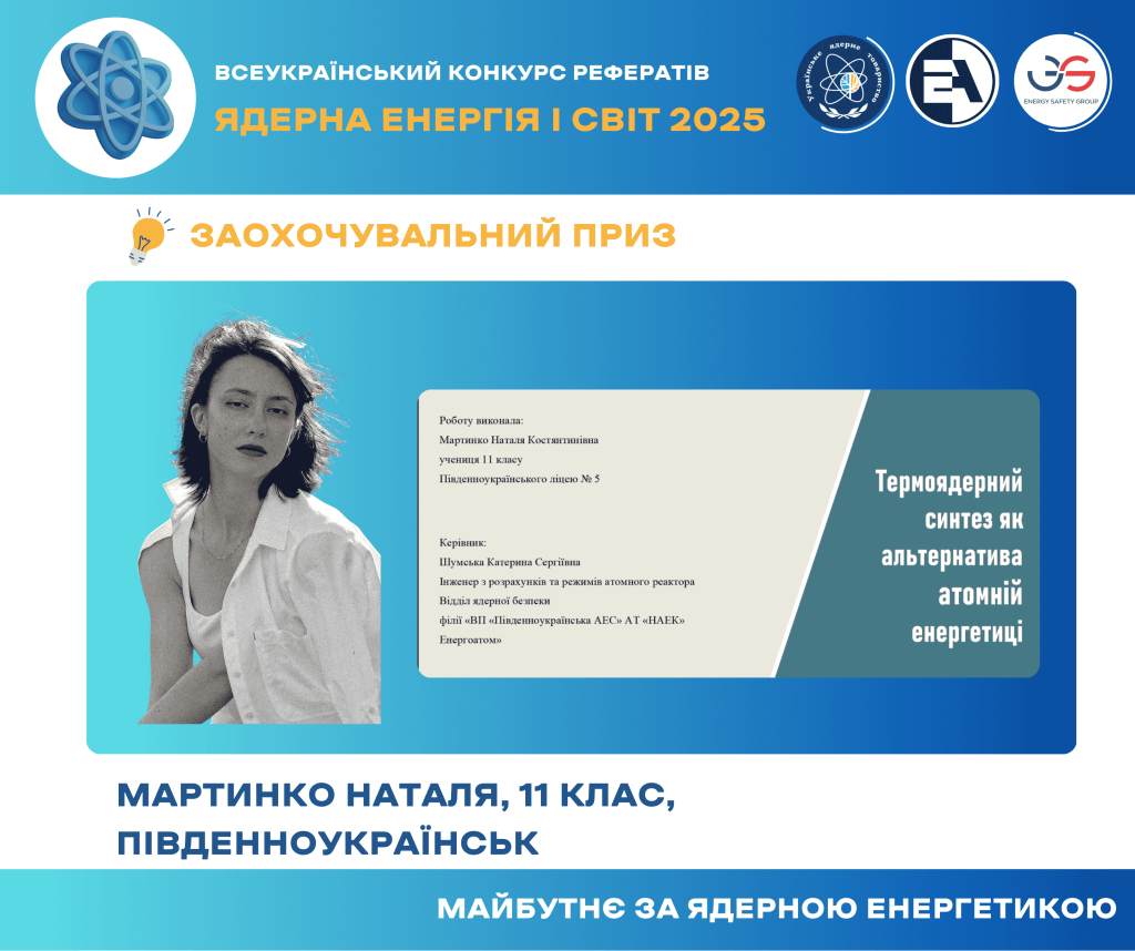 - Мартинко Наталя (м. Південноукраїнськ, ліцей 5, 11 клас) «Термоядерний синтез, як альтернатива атомній енергетиці»