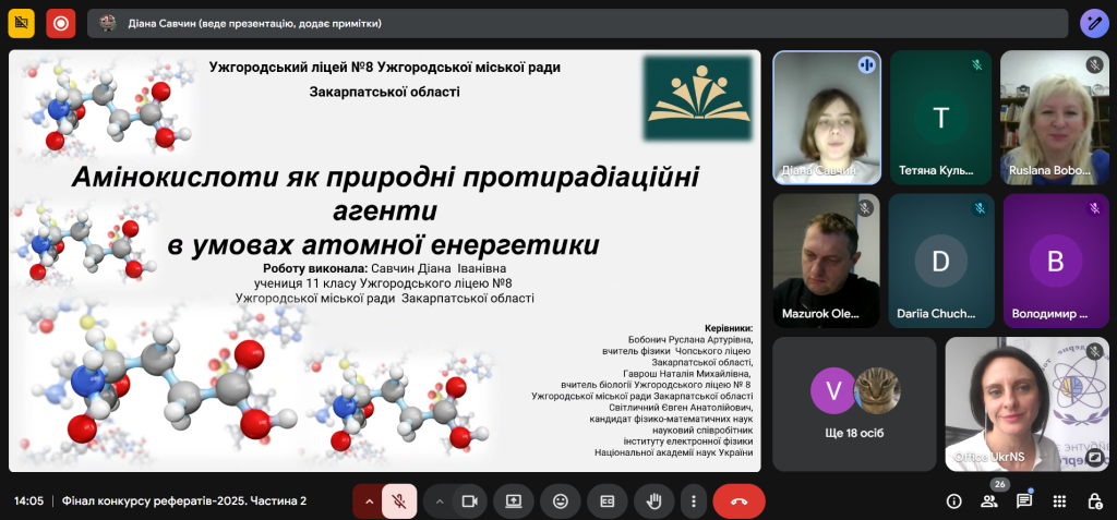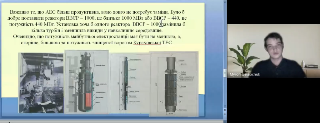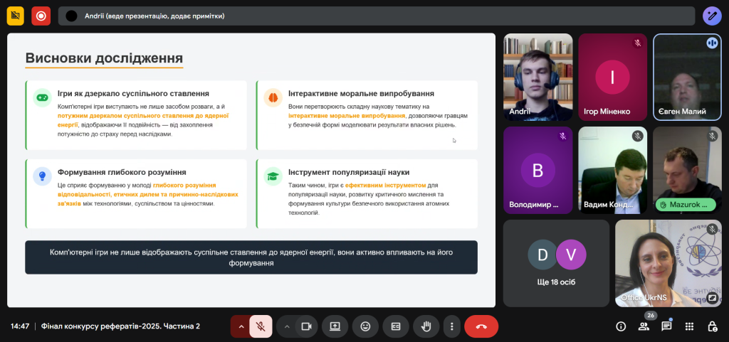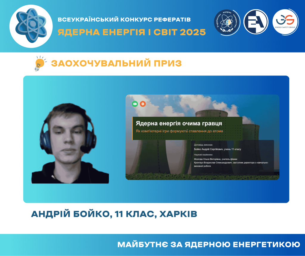 - Андрій Бойко (м. Харків, Харківський ліцей № 3, 11 клас) «Ядерна енергія очима гравця: як комп’ютерні ігри формують ставлення до атома»