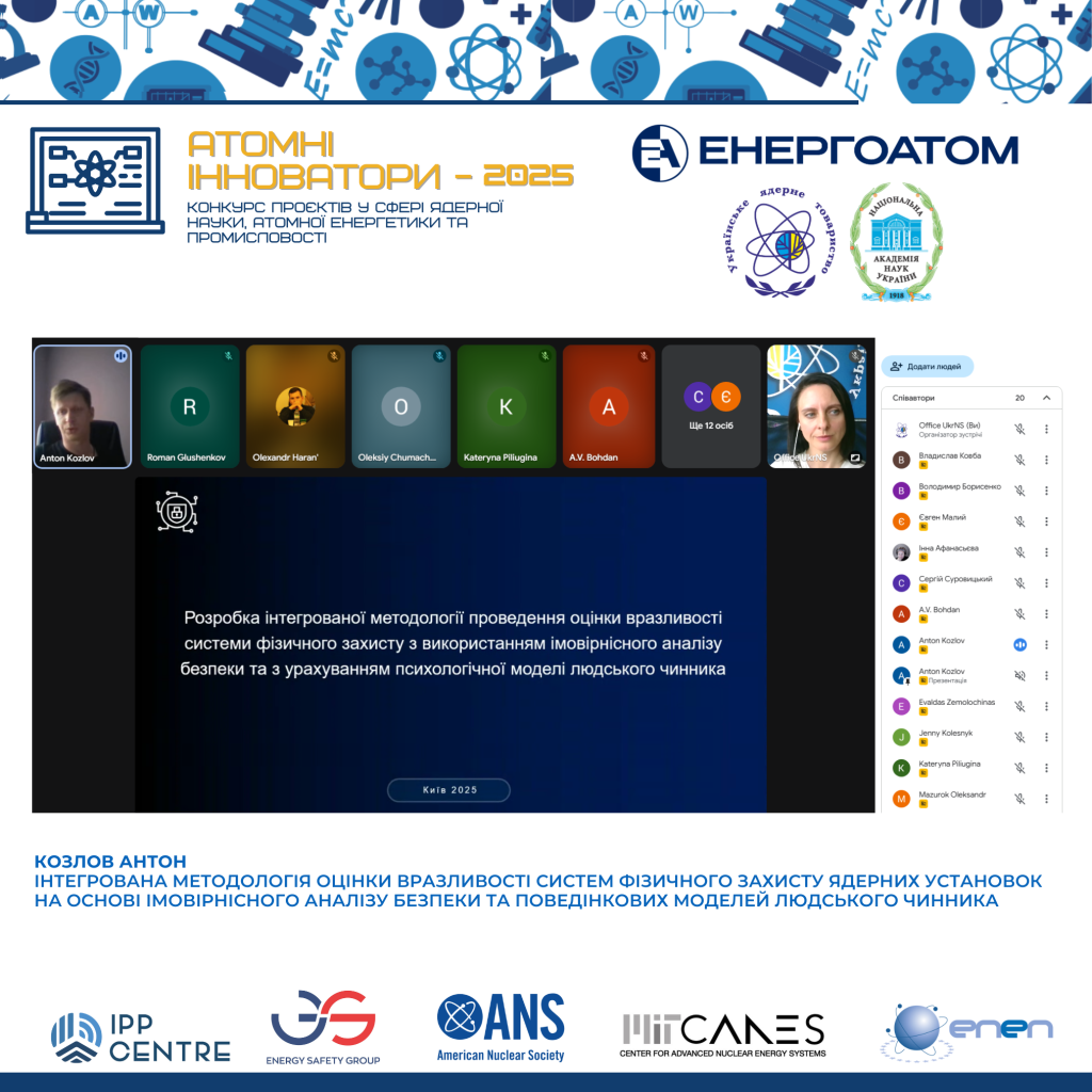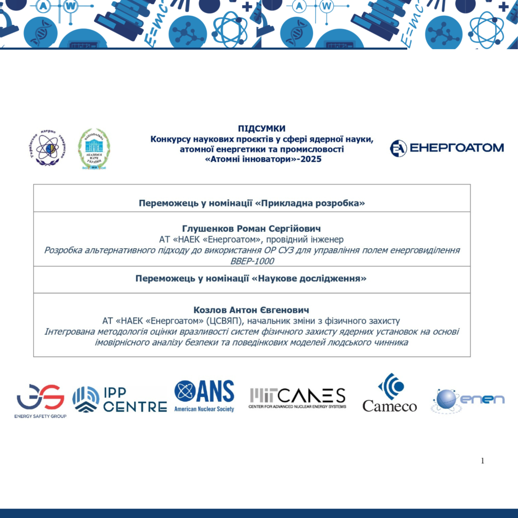 - Номінація «Наукове дослідження»: Антон Козлов, АТ «НАЕК «Енергоатом» (ЦСВЯП), начальник зміни з фізичного захисту. «Інтегрована методологія оцінки вразливості систем фізичного захисту ядерних установок на основі імовірнісного аналізу безпеки та поведінкових моделей людського чинника»