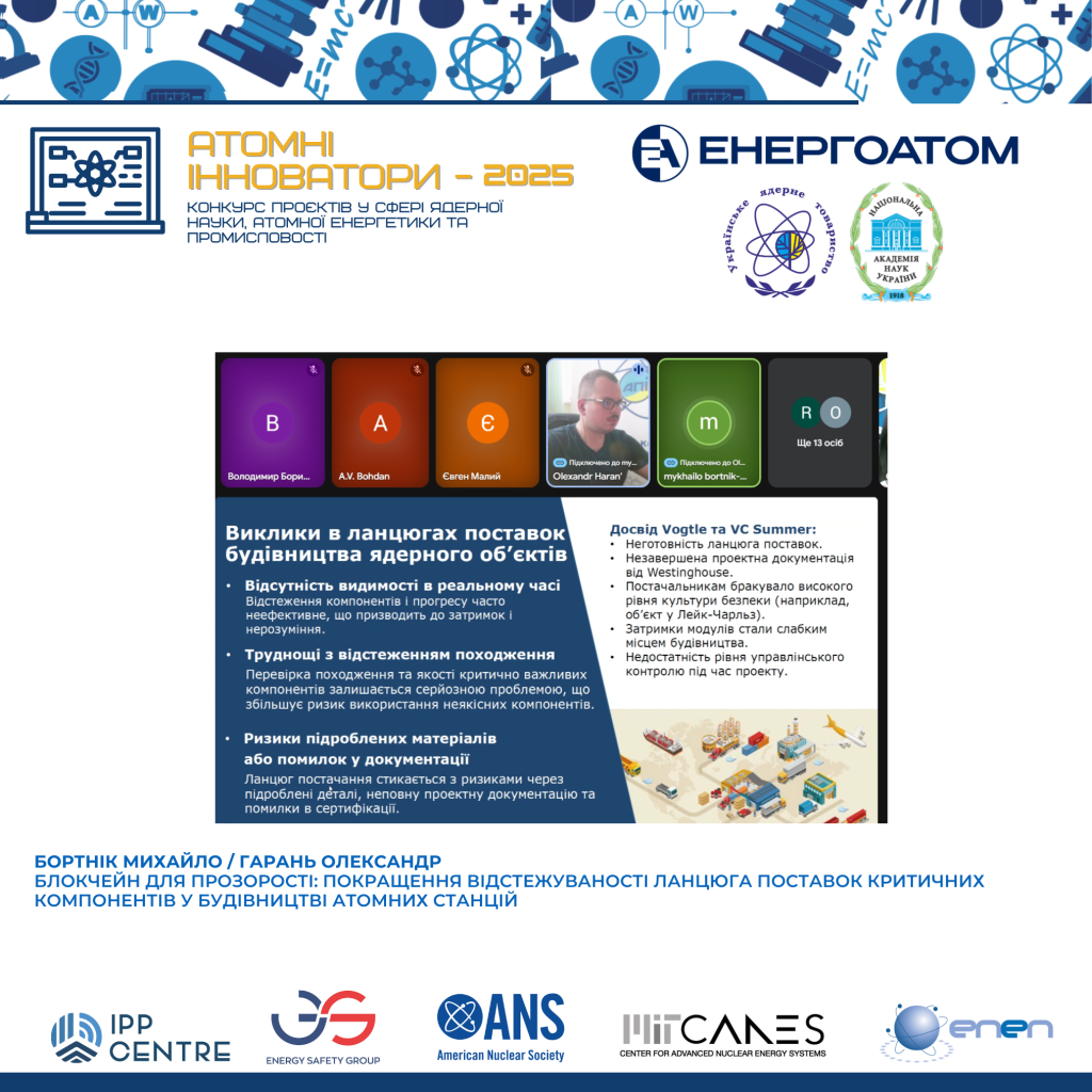 Конкурс для фахівців галузі, які прагнуть поділитися своїми розробками та дослідженнями, обмінятися ідеями та напрацюваннями, вже втретє організований Українським ядерним товариством за участю Ради молодих вчених при відділені фізико-технічних проблем енергетики НАН України, Ради молодих вчених при відділенні ядерної фізики та енергетики НАН України та за підтримки провідних компаній атомної та суміжних галузей – НАЕК Енергоатом та Групи компаній Energy Safety Group. Велику підтримку у проведенні цьогорічного конкурсу, як і у минулі роки, надали міжнародні партнери – Американське ядерне товариство та MIT CANES – Центр передових ядерних енергетичних систем Массачусетського технологічного інституту, а також компанія Cameco Corporation.