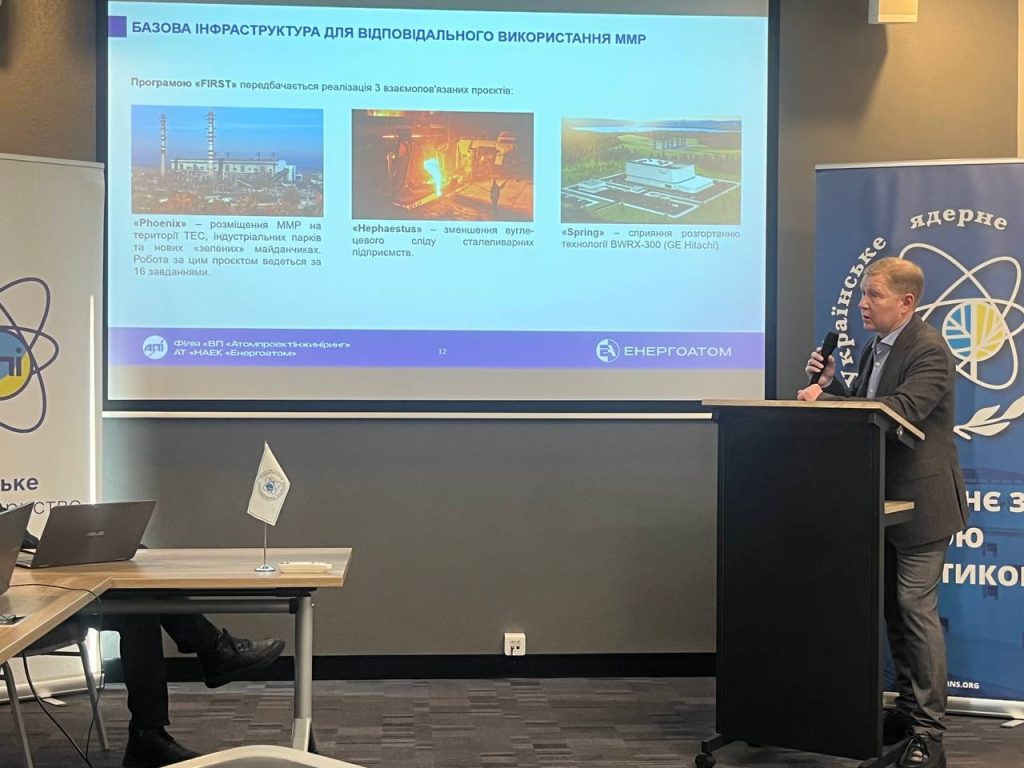 Детальний огляд технологічного ландшафту та участі експлуатуючої організації в проєктах розвитку ММР представив Олександр Косінський, заступник генерального директора філії «ВП «Атомпроектінжиніринг» АТ «НАЕК «Енергоатом». У межах доповіді було проаналізовано ключові переваги ММР та можливості їхньої інтеграції в локальні енергетичні хаби. Було проінформовано про досвід філії «ВП «Атомпроектінжиніринг» з проєктування, щодо виконаних підготовчихх робіт з розгортання ММР, про співпрацю з ДАЗВ, ПАТ «АрселорМіталл Кривій Ріг» та «Центренерго». Спікер акцентував увагу на активній міжнародній співпраці Компанії, зокрема за меморандумами із такими світовими лідерами, як Holtec International,Rolls-Royce, NuScale Power та Westinghouse. У доповіді детально розкрито результати реалізації проєкту «FIRST», що фінансується Держаним департаментом США, в рамках якого для більш детального вивчення АТ «НАЕК «Енергоатом» обрано три проєкти ММР. У доповіді розкрито набір критеріїв вибору технології ММР, порівняння їх переваг, критерії оцінки майданчиків для розміщення, аспекти співпраці з українськими установами та організаціями щодо впровадження ММР.