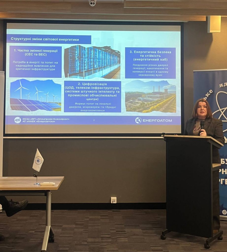 Перспективні напрями створення енергетичних хабів розкрила Марина Максименко, начальник електротехнічного сектору ВП «АПІ». Поєднання реакторів із системами зберігання енергії дозволить забезпечувати наднадійним живленням дата-центри, а надлишкову потужність спрямовувати на виробництво «зеленого» водню або аміаку. Спікерка наголосила, що інтеграція ММР і ВДЕ через енергетичний хаб вирішує одразу кілька задач: згладжування профілю потужності на точці приєднання до мережі, батарея і керовані навантаження можуть відсікати піки і заповнювати провали; оптимізація економіки, бо коли електроенергія в мережі дешевша або обмежена, енергетичний хаб може переключатися на накопичення або виробництво аміаку або водню; стійкість до  аварій мережі, коли енергетичний хаб може перейти в острівний режим і підтримувати критичних споживачів. У практичному плані енергетичні хаби можуть бути реалізовані як енергокластери навколо великих споживачів: промислові парки, ЦОД, транспортні вузли, агропереробка, хімія. У таких кластерах накопичення і конверсія дають гнучкість, а ММР – стабільну базу.