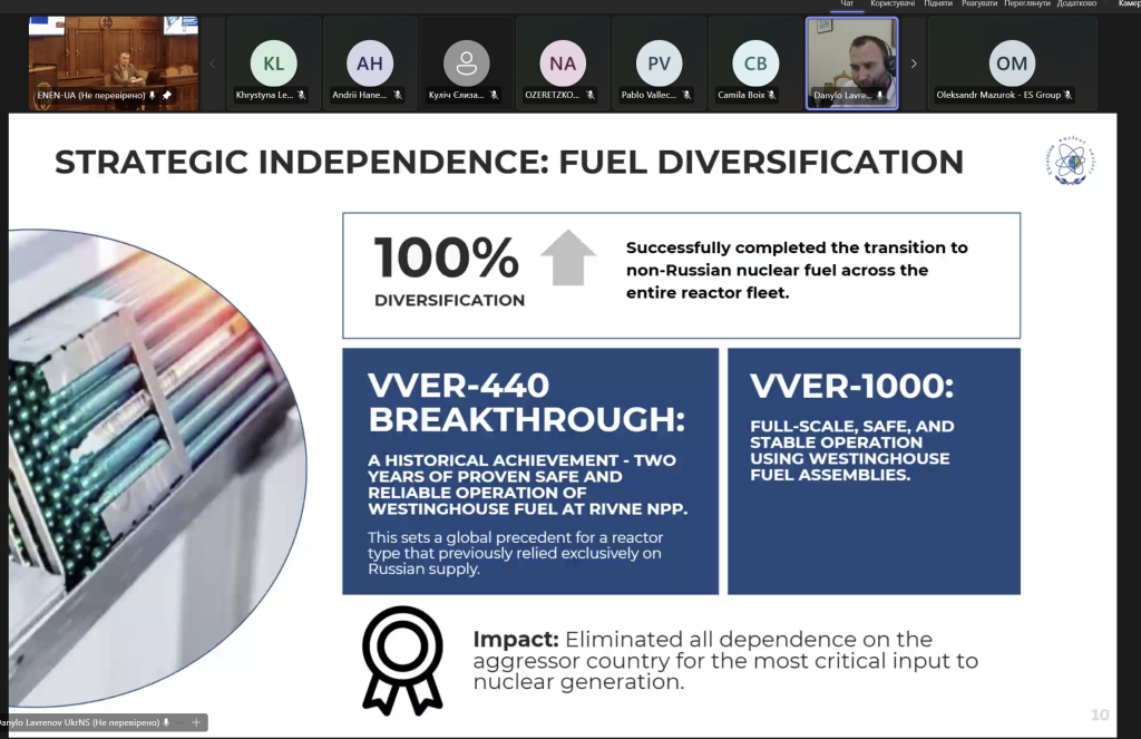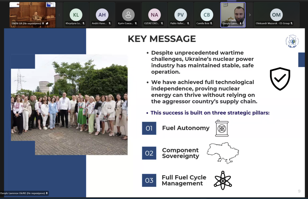 Під час воркшопу перший віце-президент, виконавчий секретар ГО «УкрЯТ» Данило Лавренов представив доповідь про функціонування української ядерної енергетики попри військові виклики. Окрему увагу було приділено питанням технологічної незалежності від рф, диверсифікації палива та критичній ситуації на окупованій Запорізькій АЕС.