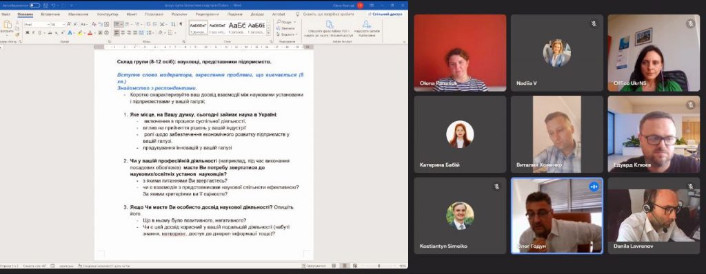 Specialists and scientists from leading enterprises and organizations of the industry were invited to participate in the focus group: SE NNEGC Energoatom, Energy Safety Group, Institute for Nuclear Safety Problems of the National Academy of Sciences [NAS] of Ukraine, Institute for Nuclear Research of the NAS of Ukraine, M.S. Polyakov Institute of Geotechnical Mechanics NAS of Ukraine, winners and participants of the competition of scientific projects in the field of nuclear science, nuclear energy and industry Nuclear innovators.