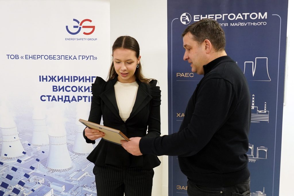 Following the award ceremony, Energoatom representatives conducted an introductory virtual tour of Ukrainian nuclear power plants for students and guests using VR headsets and power unit models. An informative discussion was also held on the principles of dosimeter operation and other topics related to the activities of the nuclear industry that were of interest to the audience.