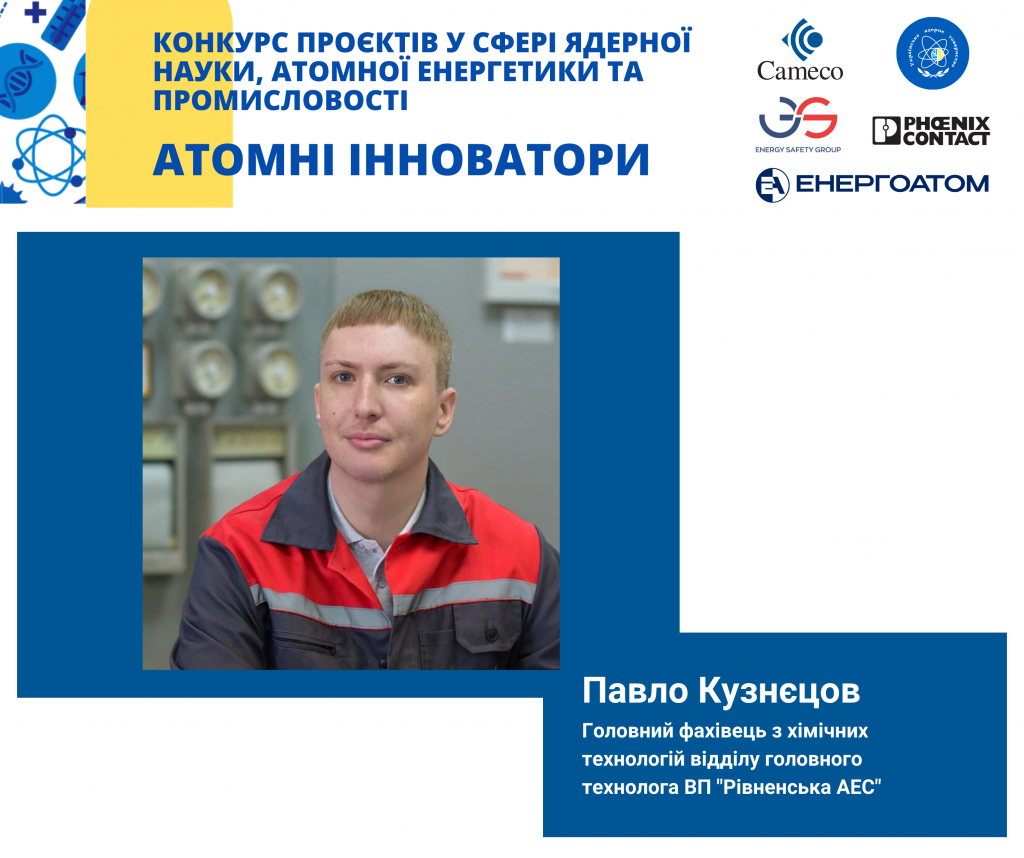 Pavel Kuznetsov is the winner of the UkrNS Сompetition of scientific projects in the field of nuclear science, nuclear energy and industry “Nuclear Innovators” in the “Applied Development” category. Pavel Kuznetsov is the chief specialist in chemical technologies of the department of the Rivne Nuclear Power Plant, and a specialist in the field of water treatment technologies at nuclear power plants.
